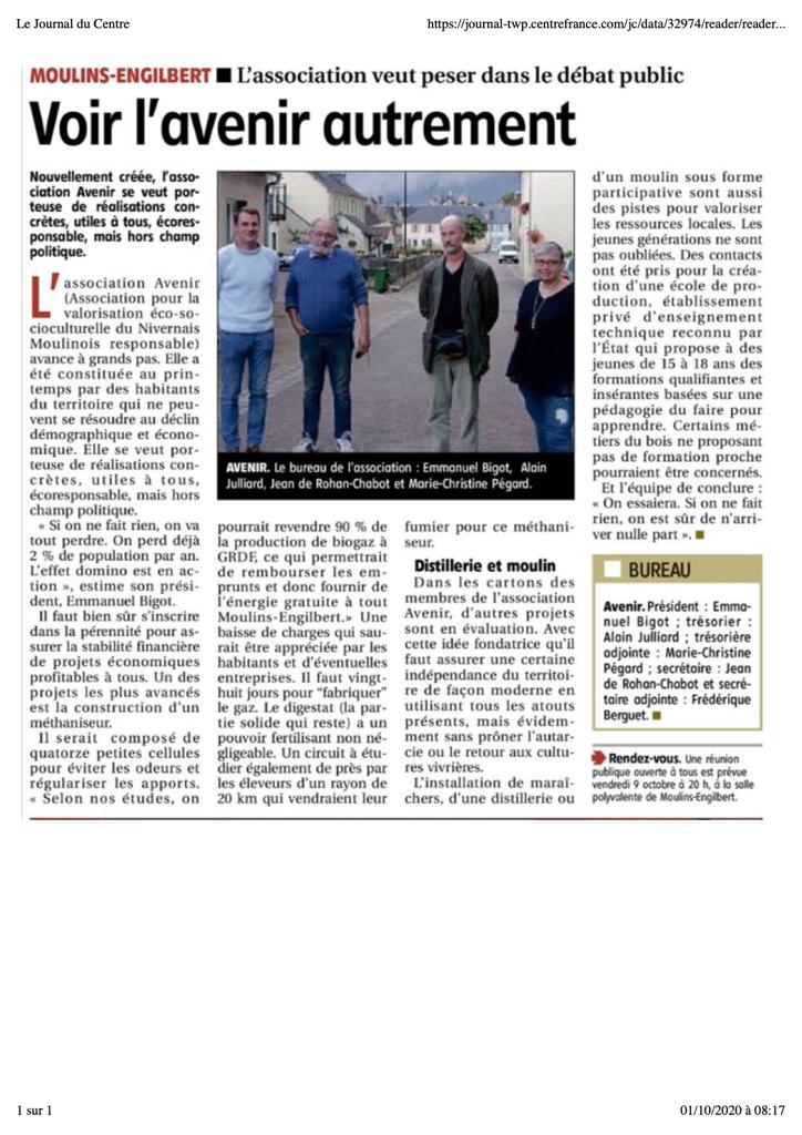 "Voir l'avenir autrement". C'est ainsi qu'est intitulé l'article dédié à notre association AVENIR dans le Journal du Centre du 05 Octobre. Un article clair et très bien rédigé qui présente nos ambitions pour Moulins Engilbert et ses environs. Cet article est pour nous un moyen de nous faire connaître davantage dans la région. Vous le trouverez ci-dessous :